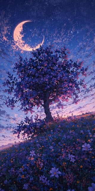 Moon over cherry blossom tree iPhone wallpaper 4K