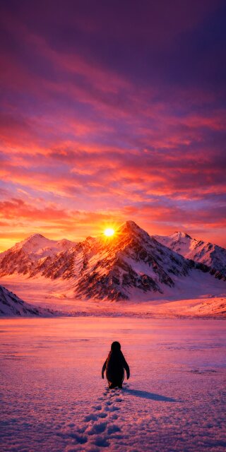 Download this stunning 4K wallpaper featuring a lone penguin trekking across a snow-covered landscape towards snow-capped mountains. This iPhone wallpaper captures the beauty of the sunset reflected on the snow and a trail of footprints.